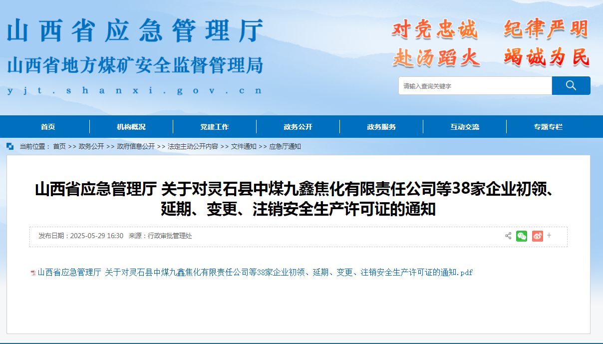 山西省應急管理廳 關于對靈石縣中煤九鑫焦化有限責任公司等38家企業初領、延期、變更、注銷安全生產許可證的通知